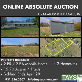 ONLINE ABSOLUTE AUCTION: 2 BR / 2 BA MOBILE HOME & BUILDINGS on 15.50 Ac± in 4 TRACTS 112 Newberry Rd Crossville, TN Begins: April 07, 2026 at 10:00AM C.T. Ends: April 28, 2026 Starting at 10:00AM C.T.