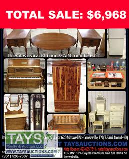 ONLINE ABSOLUTE AUCTION: FURNITURE - ANTIQUES - APPLIANCES 620 Maxwell St. Cookeville, TN Begins: November 03, 2020 at 10:00AM C.T. Ends: November 17, 2020 Starting at 10:00AM C.T.