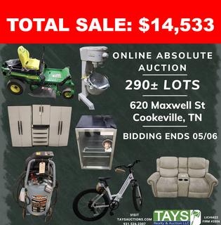 ONLINE ABSOLUTE AUCTION: FURNITURE - TOOLS - HOME DECOR 620 Maxwell St. Cookeville, TN Begins: May 13, 2025 at 10:00AM C.T. Ends: May 20, 2025 Starting at 10:00AM C.T.