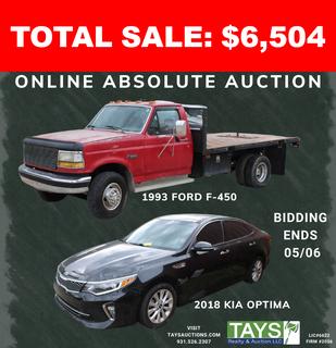 ONLINE ABSOLUTE AUCTION: 2018 KIA OPTIMA & 1993 FORD F-450 620 Maxwell St. Cookeville, TN Begins: April 22, 2025 at 10:00AM C.T. Ends: May 06, 2025 Starting at 10:00AM C.T.